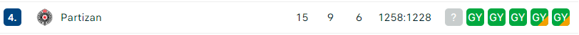 - Ezzel szemben a Partizan az egész Euroligában a legjobb formában lévő csapatként lép pályára, öt meccses győzelmi szériával büszkélkedhet. A Panathinaikosz, a Monaco, az Olimpia Milano és a Zalgiris elleni győzelmek, valamint a keddi, Valencia elleni 72-67-es győzelemmel 9-6-os mérleggel állnak, amivel bebiztosították a negyedik helyet a tabellán. A Partizan a Valenciában tett nehéz látogatása során egy agresszív védekezéséről ismert csapattal került szembe, bizonyítva, hogy képes a nehéz mérkőzéseken is helytállni. Kevin Punter 13 ponttal ismét kiemelkedő támadó teljesítményt nyújtott, és mindössze egy lepattanóval maradt le a dupla-dupláról. Zach LeDay és James Nunnally egyaránt 14 ponttal járult hozzá a sikerhez, Nunnally különösen a második félidőben volt meghatározó.