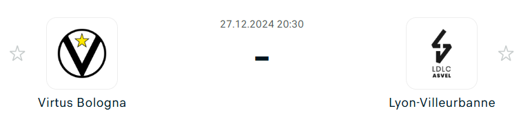 - A Virtus Bologna számára ez a szezon eddig kifejezetten gyengén alakult, hiszen 4 győzelemmel és 13 vereséggel a 16. helyen állnak, holtversenyben a Maccabi Tel-Avivval. Az előző fordulóban ugyan meglepetést okoztak a Barcelona legyőzésével (86-81), de összességében messze elmaradnak a tavalyi teljesítményüktől. A gyenge eredmények miatt Luca Banchi vezetőedző távozott, helyét Dusko Ivanovic vette át, aki három mérkőzésen két győzelmet aratott (Baskonia ellen idegenben és a Barcelona ellen otthon), valamint egy vereséget szenvedett az Olympiakosz vendégeként. A csapat komoly gondokkal küzd, hiszen Tornike Shengelia, aki 15,3 pontos és 5,5 lepattanós átlagával a legjobb játékosuk, csak január közepén térhet vissza. Isaia Cordinier 13,5 pontos átlagot hoz, de triplái pontatlansága (28,1%) aggodalomra ad okot. Will Clyburn szintén hullámzó formát mutat, jelenleg 13,2 pontot átlagol. A Virtus támadásban (112,2 pont 100 támadás alatt) és védekezésben (118,4 kapott pont 100 támadás alatt) is az Euroliga legrosszabb csapatai közé tartozik. A siker érdekében a Virtusnak kulcsfontosságú lesz lassítania az Asvel sztárját, Theo Maledont, valamint pontos külső dobásokat kell hozniuk Marco Belinelli, Matt Morgan és Isaia Cordinier révén.