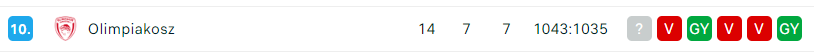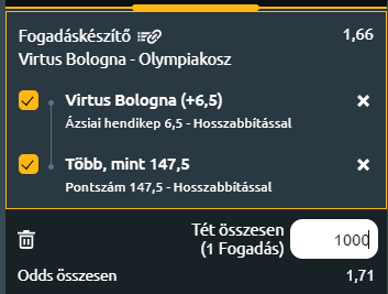 - A Virtus remekül játszik az idei szezonban otthon, ahol csak egy vereséget szenvedtek el, míg az Olympiakosz eléggé küszködik idegenben. Ennek ellenére szoros meccs lesz, nem fog mindig olyan gyengén játszani az Olymp mint legutóbb. A hazaiakat erősítem hendikeppel és legalább 148 pontot várok.