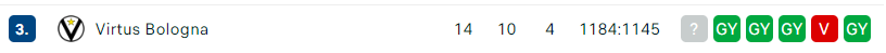 - A Virtus az Euroliga egyik legnagyobb meglepetése az idei szezonban. A hagyományokkal és nagy szurkolótáborral rendelkező csapat remekül kosárlabdázik, és 10-4-es mérleggel holtversenyben a második helyen áll a Barcelonával. Luca Banchi hozta ki a legtöbbet a Virtus csapatából. Az Euroliga utolsó fordulójában egy kellemetlen Baskoniát győztek le idegenben, ahol a Virtus csapatának minden minősége és tapasztalata megmutatkozott. Marco Belinelli úgy játszik, mint legjobb napjaiban, a csapat motorja és vezére azonban Tornike Shengelia, aki mindkét palánk alatt dominál, és az Euroliga egyik leghasznosabb játékosa. De a Virtus is sebezhető, ezt pedig a hazai bajnokságban be is bizonyították. Előbb az Olimpia Milanótól kaptak ki, az utolsó fordulóban pedig hosszabbítás után a Venezia ellen szenvedtek vereséget. Mickey hiánya komoly veszteség, vele sokkal hatékonyabb a játék.