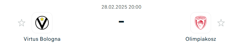 - Az Olympiakosz a liga egyik legjobb csapata, jelenleg 19 győzelemmel és 7 vereséggel az Euroliga élmezőnyében áll. A görög kupadöntőben vereséget szenvedett a Panathinaikosz ellen, ezzel elveszítette hatmeccses győzelmi sorozatát, de az Euroligában három mérkőzés óta veretlen. A csapat kiegyensúlyozott és hatékony mindkét oldalon! Támadásban a liga legjobbjai közé tartozik, 125 pontot termel 100 támadásban, miközben a legtöbb pontot szerző együttes 87,9-es átlaggal. Kiemelkednek a gólpasszok terén is, valamint kinti dobásaik stabilak. A legnagyobb problémájuk a lepattanózás, amit az egész szezon során tapasztalható állandó sérülések-probléma. Kontrollált, fegyelmezett játékuk van, meccsenként mindössze 11,7 eladott labdájuk a negyedik legjobb mutató a ligában. A kulcsemberek közül Sasha Vezenkov kimagasló formában van, 20,6 pontot átlagol 43,8%-os triplamutatóval, míg Evan Fournier szintén stabil pontszerző (16,8 pont). Nikola Milutinov is kulcsfontosságú szerepet tölt be a palánk alatt, de sérülésekkel küzd, ami kérdésessé teszi a játékát. Az Olympiakosz fő célja az lesz, hogy fizikális fölényét kihasználja a palánkok alatt és erős védekezéssel elbizonytalanítsa a Virtust.