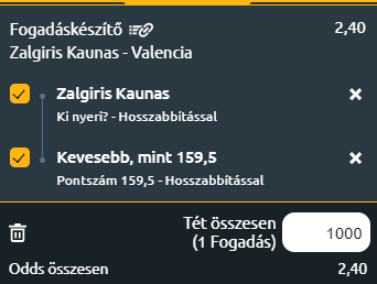 - Bár a Zalgiris hazai pályán esélyes lehet a győzelemre, várhatóan egy végig kemény, szoros és kevésbé gólgazdag mérkőzés lesz. Zalgiris Kaunas meccsgyőzelem + kevesebb mint 159,5 pont a mérkőzésen