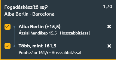 - Az Alba Berlin az utóbbi időben képes volt meglepetéseket okozni, hiszen legyőzte a Maccabi Tel-Avivot, valamint szoros meccset játszott a Crvena Zvezdával is. A keret minőségbeli hiányosságait küzdőszellemmel ellensúlyozzák. A Barcelona a vártnál jóval gyengébben teljesít a szezonban, és a sérülések is komoly problémát jelentenek számukra. A katalán sajtóban pedig már arról is pletykálnak, hogy a csapat több játékosa távozás előtt állhat. Mindezek alapján nem várható, hogy a Barcelona nagy különbséggel nyer, így az Alba Berlin +15.5 hendikep opció kötve a minimum 162 pontszámmal ígéretes választásnak tűnik.