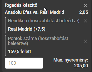 - A Real és az Efes az elmúlt években nagyon izgalmas és kiegyenlített meccseket játszott, ez idén is várhatóan így lesz. A törökök még láthatóan nincsenek túl jó formában, de a keret minősége adott ahhoz, hogy jó szakmai munkával ebből igazán jó csapat váljon majd. A Real jelenleg előrébb jár, de ezt a különbséget a szenzációs hazai szurkolók kiegyenlítik majd. Szoros meccset várok pár ponttal nyerhet majd az egyik csapat, a bukik a törököknek adják a nagyobb esélyt, de ez szerintem a hazai pályának szól és a múltbéli sikereknek. Én a két csapat Barcelona elleni meccseiből indulok ki és a pillanatnyi formából, ez pedig a vendégek felé billenti a mérleg nyelvét. A hazai csarnok előnyét pedig remekül veszi el majd egy + 7,5-es hendikep a spanyoloknak. A pontok tekintetében pedig, ha a kulcsjátékosok jók lesznek, minimum 160-at várhatunk.