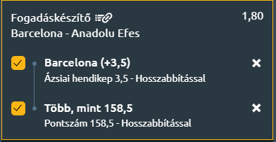 - A Barcelona hazai pályán, a Panathinaikosz elleni győzelem adta önbizalommal felvértezve esélyesebb a győzelemre. Az Anadolu, ha összeáll, jó csapat lehet, de még nem az. A Barcát segítem plusszos hendivel és az over felől megyek!