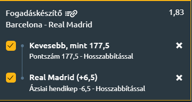 - Mindezek alapján a találkozó kiegyenlített lehet, de Shengelia bizonytalan állapota, valamint a Barcelona formabeli ingadozása miatt a vendégek esélyei egyértelműen jobbak. A Real Madrid több stabil teljesítményt nyújtó játékossal rendelkezik, védekezése megbízhatóbb, és ez elegendő lehet ahhoz, hogy egy kis plusszos hendikeppel nyeressük őket, a pontok tekintetében pedig 177,5 alatt marad a számláló.