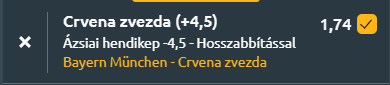 - A Crvena Zvezda idegenben is erős ellenfél, és a közelmúltban többször is hajszál híján maradt csak alul elitcsapatokkal szemben. A Bayern védekezésbeli problémái és az ingadozó forma alapján reális esély mutatkozik arra, hogy a szerbek még idegenben is megszorongassák a bajorokat. A zvezda győzelmét kis plusszos hendikeppel segítem. Crvena Zvezda +4,5 – 1,74