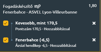 - A Fenerbahce eddig nyolc meccsből csak hármat nyert, öt vereséget szenvedett, és legutóbb Madridban szenvedett súlyos, 84–58-as vereséget, ami után a vezetőedző nyilvánosan is kritizálta csapatát. Az eddigi problémák főként a kreativitás hiányára, a rendezetlen támadójátékra és a gyenge hárompontos hatékonyságra vezethetők vissza, miközben a védekezés sem az előző szezon szintjén működik. Az Asvel számára az idény eddig különösen nehéz volt, hiszen szintén nyolc meccsből csak két győzelmet arattak, és több kulcsjátékosuk, köztük Nando De Colo, Edwin Jackson, Thomas Heurtel és Shaquille Harrison is sérült, így az irányítást egyedül a mindössze 18 éves Adam Atamna kénytelen ellátni. Tekintettel a hazaiak és a vendégek jelenlegi állapotára, az előző meccsek statisztikáira és a hiányzó játékosokra, valószínűsíthető, hogy a csapatok nem tudnak magas pontszámot produkálni, ezért a találkozó alacsony összpontszámmal zárulhat és a mérkőzés várhatóan 170,5 pont alatt marad és nyerni fog a Fener tükörsimán, akár kisebb mínuszból is.