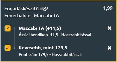 - Összességében a Fenerbahce jelenleg gyenge formában és szervezetlen támadójátékkal várja a találkozót, míg a Maccabi Tel Aviv, bár sokszor saját hibáinak köszönheti vereségeit, bizonyította, hogy képes felvenni a harcot a legjobbakkal is, elég, ha a Real Madrid elleni sikerükre gondolunk. A semleges helyszín és a török csapat támadási problémái miatt várhatóan a Maccabi képes lesz szoros mérkőzést vívni, ezért egy komolyabb plusszos hendikeppel a Maccabit segítjük. Ha pedig abból indulunk ki, hogy a török csapat védekezése kiváló, ellenben gyengék támadásban, akkor az azt jelenti, hogy nem lesz 179 pontnál több a meccsen!