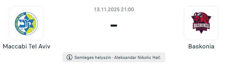 A Maccabi Tel Aviv Belgrádban fogadja a Baskonia csapatát az Euroliga 11. fordulójában. Az izraeli gárda még mindig semleges helyszínen kénytelen lejátszani a mérkőzéseit, hiszen Izraelben biztonsági okok miatt nem rendeznek sporteseményeket.