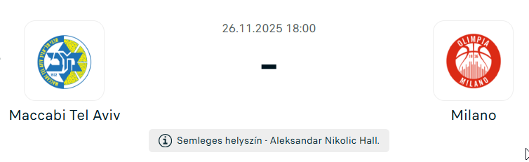 A Maccabi még mindig semleges helyszínen fogadja az olasz Olimpia Milano csapatát. Egy kiélezett, magas pontszámú találkozóra számíthatunk, hiszen mindkét csapat támadójátékában vannak lehetőségek.