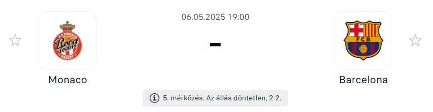- A mérkőzésen továbbra is a Monaco, elsősorban a hazai pálya előnye miatt. A sorozat korábbi két meccsén saját közönségük előtt határozottan játszottak, viszont legutóbb nem tudták kezelni a tétet! Ma pedig még nagyobb lesz a tét, még inkább érezni fogják a Monacói játékosok azt, hogy nagy az elvárás, ezt pedig nyomja majd a vállukat. Hiába jobb valamivel a csapatuk, a rutin, a kiélezett helyzetek kezelése eddig nemigen ment. Az előző meccsen gyengébben céloztak távolról, és túl sok labdát adtak el! Ha ezeken nem tudnak nagyságrendekkel javítani, akkor baj lehet! Barcelona ugyan lendületben van, de idegenben továbbra is gyengébbek, és a vezéregyéniség hiánya még döntő lehet. Viszont a nyomást egyértelműen jobban tudják kezelni a katalánok, van rutinjuk és ez sokat számít. Végletekig kiegyenlített meccsre lehet számítani, ahol én a mentális faktort emelném ki. Plusszos hendikeppel a Barcelonát nyeretem és ők jutnak a Final Fourba. Tipp: Barcelona +6,5, amikor megjátszottam 1,7-öt adtak érte.