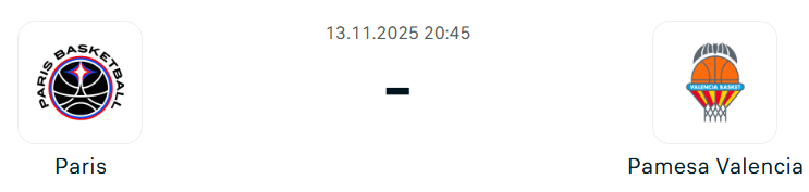 - A Paris 4–6-os mérleggel áll, legutóbb a Panathinaikos ellen kapott ki 95–101-re, miután az utolsó negyedben összeomlott a védekezése. A szezon során legfőbb gondjuk a gyenge dobóforma, különösen a hárompontos vonalon, ahol az egyik legrosszabb mutatóval rendelkeznek a mezőnyben. A gyors játékstílusuk sok eladott labdát eredményez, miközben bár vezetik a mezőnyt a támadópattanók számában, ezeket ritkán váltják pontokra. A legmegbízhatóbb játékosuk Nadir Hifi, aki 22,1 pontos átlagával vezeti a csapatot, de távolról továbbra sem hatékony. Mellette Justin Robinson stabilabban dob kintről, Sebastian Herrera és Yakuba Ouattara pedig fokozatosan egyre több szerepet kapnak, míg Mouhamed Faye a lepattanókban erős, de támadásban korlátozott. A Valencia jó formában van. 6–4-es mérlege és gyors, látványos játéka miatt sok elismerést kapott. A legtöbb hárompontos kísérletet vállalják a ligában, miközben magas hatékonysággal dobnak, és második helyen állnak a támadópattanókban. A Real Madrid ellen mindössze kilenc labdát adtak el, és többször is sikeresen alkalmazták a teljes pályás letámadást. A csapat legjobb formában lévő játékosai közé tartozik Omari Moore, aki sokoldalú támadójátékával és nehezen védhető dobásaival tűnik ki, míg Darius Thompson higgadt irányítással tartja egyensúlyban a fiatal keretet. Jean Montero fokozatosan visszanyeri formáját, Kameron Taylor pedig minden statisztikai mutatóban hasznos.