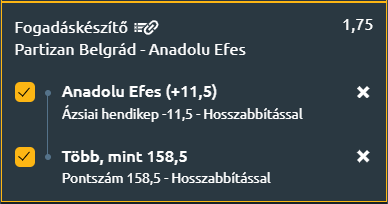 - Az eddig látottak alapján az Anadolu Efes mutatott szervezettebb és hatékonyabb támadójátékot. A törökök támadásai ritmusosabbak, több tudatosságot és kombinációt mutatnak, míg a Partizan sokszor egyéni megoldásokra támaszkodik, ami kiszámíthatóvá teszi őket. A törökök erős támadójátéka miatt mindenképp over oldalról közelítek, legalább 159 pont várható, ami pedig a kimenetelt illeti a törökök erősebbek, ám a hazai környezet nagyon sokat jelent. +11,5-es hendikep elég kell, hogy legyen az Anadolu nyeretéséhez!