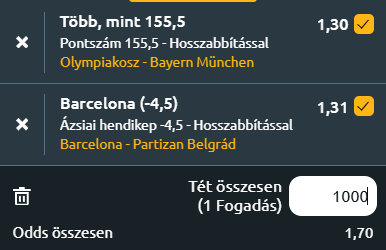 Az Euroliga mai játéknapján Az Olympiakosz hazai-, Bayern elleni meccsét és a Partizan Belgrád barcelonai vendégjátékát hoztam egy biztonsági kötésben.