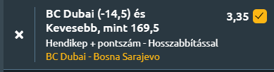 Az ABA Liga felsőházában a 16 meccsből 15-öt megnyerő és ezzel listavezető Dubai (miafaszt keresnek ezek az Adriatic Basketball Association-ban?) a 8. helyen álló Bosnát fogadja. Elég egyoldalú meccsnek néz ez ki.