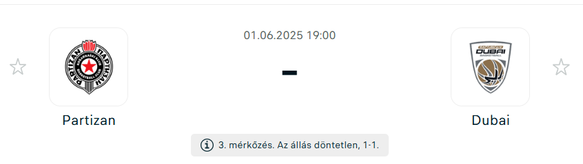 - A párharc harmadik mérkőzése minden szempontból más lesz. A Partizan kétszer is bebizonyította hazai pályán, hogy képes teljesen kioltani a Dubai támadójátékát, és amennyiben ezúttal is megvalósul a védekezési fókusz, a szerb csapat esélyei sokkal jobbak. Az első meccsen látott dominancia és a hazai környezet támogatása is mellettük szól. Ugyanakkor Dubai megmutatta, hogy ha beindul a dobóforma és kevesebb a hiba, akkor komoly ellenfél. Ma pedig egyiküknek sincs veszítenivalója, de az esélyesség terhe a Partizant nyomja! A dubai pénzből összerakott csapat szorossá teheti a meccset! Nyerhet a Partizan, erre jó esély van, de nem lesz nagyobb különbség 11 pontnál!