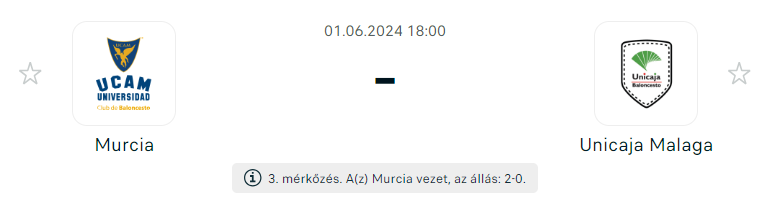A spanyol élvonalbeli kosárlabda liga rájátszásának elődöntős párharcában vagyunk. Immáron a harmadik mérkőzés következik, ezúttal már Murciában, a Palacio de Deportes de Murcia csarnokban. A Murcia az első két mérkőzésen hatalmas meglepetést okozott, mindkét meccsen legyőzte az Unicaját Malagában. Nagyon érik a csoda, hogy az előzetesen esélytelenebbnek ítélt csapat jut a döntőbe.