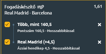 - A Real Madrid formája alapján egyértelműen esélyesebb. Ráadásul hazai pályán játszanak, és több pihenőt is kaptak a rangadó előtt. Ezzel szemben a Barcelona mély gödörben van, és ha nem nyújtják szezonbeli legjobb teljesítményüket, akkor a Real simán nyerni fog és legalább 161 pont várható ilyen két csapat között. Én egy erősebb esélyt hoztam, kicsi plusszos hendivel megerősítve a Realt, mégiscsak az El Classicóról van szó! De jóval komolyabb szorzóért elengedhető sima meccsgyőzelemmel is a Real, plusz az over, nyilván ekkor a kockázat is nagyobb valamivel.