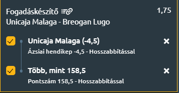 - Az Unicaja egyértelmű esélyesként várja a mérkőzést. Hazai pályán kiváló formában vannak, támadásban és védekezésben is kimagasló statisztikákkal rendelkeznek. Ezzel szemben Breogan a leggyengébb támadójátékot produkálja a ligában, ráadásul elveszítették legjobb játékosukat. Kis mínuszos hendikepről is nyerethető a hazai gárda és minimum 159 pontot várhatunk!