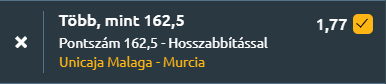 - A sorozat első meccsén összesen 167 pontot szereztek, pedig az Unicaja közel sem volt olyan hatékony, mint szokott lenni. Mindkét gárda gyors tempóban kosarazik, tempót diktálnak és ponterősek. A házigazdáknak mindenképpen nyerniük kell ma, ezért még inkább felpörgetik majd a tempót, hogy ezzel is megakadályozzák a Murcia kiváló zónavédekezését. Ma is esélyes a sok pont a meccsen! Több mint 162,5 – 1,76