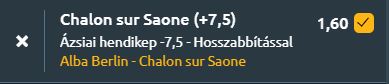 - A német csapat kerete gyengébb, mint az előző években, és már most látszanak a bizonytalanság jelei. A Chalon Saone viszont hatalmas önbizalommal érkezik, hiszen a Murcia és a Monaco legyőzése is azt mutatta, hogy a francia újonc képes felülmúlni a papírformát. Ha Jeremiah Hill visszatér, a csapat még erősebb lehet. A körülményeket és az eddigi formát figyelembe véve várható, hogy a Chalon partiban lesz Berlinben, és egy kis plusszos hendivel nyerethetjük őket.