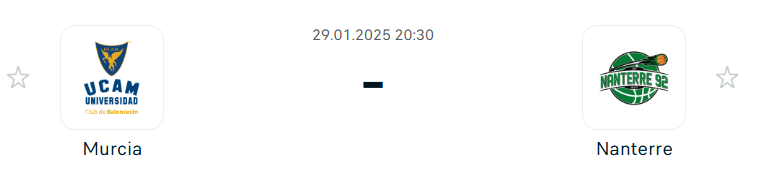 - A Nanterre az elmúlt öt mérkőzéséből kettőt nyert meg, mindkettőt alacsony pontszámú találkozón. A francia bajnokságban legutóbb szoros vereséget szenvedtek Bourg otthonában, míg a FIBA Bajnokok Ligájában a rájátszásban az Oostendét búcsúztatták. A csapat erőssége az agresszív védekezés! , A támadójátékuk átlagos (11. hely támadómutatóban, 13. hely a pontszerzésben 81,1-es átlaggal). Védekezésben jobban teljesítenek, de komoly problémájuk a lepattanózás, hiszen a liga legrosszabb csapata ebben a mutatóban. Sokat építenek a labdaszerzésekre és a gyors indításokra. Desi Rodriguez 15,3 pontot átlagol, mellette Justin Tillman és Roko Prkacin is meghatározó. Ahmad Caver sokoldalú, kemény és okos játékos, aki több statisztikai kategóriában is hozzájárul a csapat teljesítményéhez. A Nanterre célja, hogy az agresszív védekezéssel hibákra kényszerítse Murciát, viszont a palánk alatti gyenge lepattanózás komoly gondokat okozhat számukra.