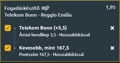 - A Bonn a támadóereje miatt papíron esélyesebb lehet, azonban Reggiana fegyelmezett védekezése és lassabb tempója megnehezítheti a németek dolgát. Bonn legnagyobb gondja a gyenge védekezés, míg Reggiana fő problémája az alacsony pontszerző hatékonyság. Mindezek alapján kevés pontot várhatunk, vagyis az UNDER oldaláról közelítek, a meccsen pedig a hazaiak az esélyesebbek, ezért kicsi plusszos hendikeppel segítem a Bonn győzelmét. Elég jó szorzót adnak a kombóra!
