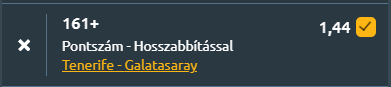 - Mindkét csapat támadásban hatékony, a Tenerife sorra termeli a pontokat, míg a Galatasaray agresszív játékstílusa és védekezési sebezhetősége nyílt mérkőzést vetít előre. A várakozások szerint sokpontos találkozó alakul ki, ahol a 161,5 pont feletti összpontszám vállalható tipp. Sajnos nincs sok lehetőség, így marad önmagában ez!