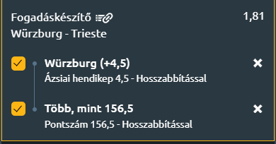 - A Würzburg remek formában kezdte a szezont, és bizonyította, hogy kulcsjátékosa hiánya sem törte meg a lendületét. A német együttes szervezettsége, jobb meccsritmusa és hazai pálya előnye komoly fegyver lehet. Ezzel szemben a Trieste új edzővel és kissé szétesett játékkal érkezik, amit a Trapani elleni vereség is jelez. Az olasz csapatnak még mindenképp időre van szükség a fejlődéshez, a németek hazai csarnokban, kiváló formában vannak. Legalább 157 pontot várhatunk a hazai lendület miatt, és nem lebecsülvén az olasz csapatot, ahol bőven van minőségi alapanyag, pici plusszos hendivel segíthetjük a német gárda győzelmét!