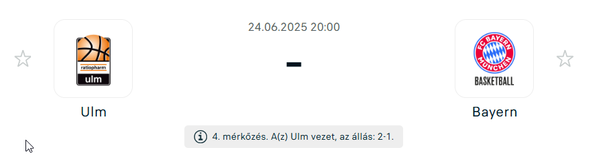 - Az Ulm remek formában van, különösen otthon, és egyetlen győzelemre van a bajnoki címtől. A lendület, az önbizalom és a hazai pálya előnye mellettük szól. Ugyanakkor a Bayern tapasztalt és veszélyes, különösen ha a védekezést és a lepattanózást tekintjük. Most pedig ki fog jönni a tapasztalat és a rutin! Szoros meccsen nyerni fog a Bayern!