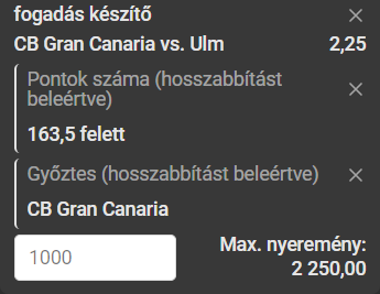 - Az Ulm nagyon hatékonyan és lendületesen támad, de a védekezéssel komoly problémák vannak, amit a rutinos spanyol alakulatnak ki kellene használnia. Emellett a hazai környezet is komoly szinttel maga oldalára billenti az esélyességet. Otthon nagyon jól kosárlabdázik a Gran Canaria, de a németek is oda fogják tenni magukat. Pontgazdag, jó meccset várhatunk, amit a Gran Canaria nyer meg. Viszonylag szoros meccs lesz, két oldalról lehet megközelíteni. Vagy -6 körül hendiről érdemes még nyeretni a Gran Canariát, ezért olyan 1,6 körüli szorzót adnak, vagy ha a németeknek jön ki jól a támadásokban rejlő lehetőség, akkor a vendégek nyeretése lehet jó +8,5 körül, amiért szintén 1,65 körül adnak. Vagy pedig a fogadáskészítő segítéségével lehet egy jó tippet létrehozni: