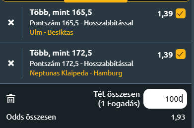 - Az Ulm remekül kezdte a szezont, öt győzelemmel indított, ám az elmúlt három találkozón két vereséget is szenvedett el, előbb a Bundesligában a Mitteldeutscher ellen, majd a Német Kupában az Alba Berlinnel szemben. Mindkét alkalommal ugyan vezetett a félidőben, de drámai visszaesést mutatott a második játékrészben: támadásban összeomlott, védekezésben pedig 50 pont fölötti félidőt engedett ellenfeleinek. A nemzetközi porondon viszont továbbra is lendületben van, hiszen a EuroCupban mindhárom eddigi meccsét megnyerte, átlagosan 99 pontot szerezve, és a sorozat legpontosabb hárompontosdobó csapataként 48,1%-os hatékonysággal tüzel. Az Ulm játéka az egyéni megoldásokra épül, viszont gyenge lepattanózás és laza védekezés jellemzi, ami kockázatot jelenthet. A Besiktas ezzel szemben két korai vereség után (a Fenerbahce elleni Szuperkupa-döntőben és a Lietkabelis elleni EuroCup-nyitányon) öt győzelemmet ért el, ami visszahelyezte őket a formában lévő csapatok közé. Az isztambuliak támadójátéka remekül működik, az elmúlt öt találkozón átlagosan 95 pontot értek el, és csak legutóbb, az Esenler Erokspor ellen maradtak 90 alatt, de így is simán nyertek. Bár a támadólepattanózás továbbra is gyenge pontjuk, ezúttal kedvező helyzetben lesznek, hiszen Ulm szintén nem erős a védőlepattanókban. Jonah Mathews, Anthony Brown és Devon Dotson bármelyik ellenféllel szemben képes 20 pont fölé jutni, így minden adott egy gólzáporos mérkőzéshez. Ez az összecsapás főként a támadójátékokról fog szólni, hiszen mindkét fél a gyors tempót és a pontgazdag kosárlabdát kedveli. Az Ulm hazai pályán továbbra is rendkívül hatékony lehet támadásban, míg a Besiktas kihasználhatja a németek védekezési gyengeségeit. Minden jel arra utal, hogy a találkozó bőven túllépheti a 165,5 pontos határt, és a nézők látványos, nagy iramú, pontgazdag mérkőzést láthatnak.