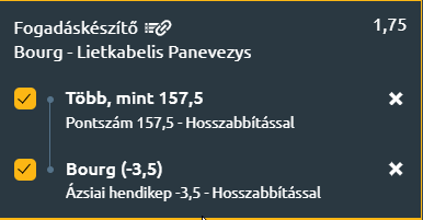 - A mérkőzés esélyese egyértelműen Bourg, amely hazai pályán a liga legjobb védelmével és mélyebb rotációval rendelkezik, míg a Lietkabelis rövidebb kerete és ingadozó formája hátrányt jelenthet. Pici mínuszról elengedem a Bourg-t, valamint legalább 158 pontot várhatunk a meccsen.