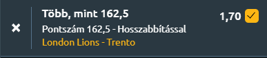 - Mindkét csapat felemás eredményeket ért el a közelmúltban. A London Lions hazai bajnokságában fölényesen menetel, ám a nemzetközi porondon egyelőre gyengébbnek bizonyult. A Buducnosttól és a Besiktastól is súlyos vereséget szenvedtek, ami megmutatta a csapat korlátait az EuroCup szintjén. Joel Scott remekelt az angol bajnokságban, de a nemzetközi meccseken eddig nem tudott vezérré válni, és több kulcsjátékos, pl. Karolis Lukosiunas sem hozza a tőle várt teljesítményt. A vendég Trento szintén kiszámíthatatlan, a Bourg elleni 31 pontos hazai vereség után Buducnost otthonában arattak meglepően magabiztos sikert, de az olasz bajnokságban ismét visszaestek. A csapat kulcsembere Devante Jones, aki az idény elején remek formába lendült, és a fiatal Cheickh Niang is egyre több lehetőséget kap. Ugyanakkor Trento legnagyobb gondja az állandóság hiánya, ami miatt nehéz megjósolni, melyik arcát mutatja majd Londonban. Mindezek alapján egy tempós, sok dobáskísérlettel tarkított összecsapás várható, ahol a gyenge védekezések és a gyors támadások miatt bőven 162,5 pont fölé kúszhat az összesített pontszám.