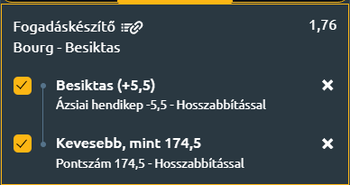 Biztonsági tipp (ez a főtipp): Besiktas +5,5 és kevesebb, mint 174,5 pont a meccsen - 1,76-ért
