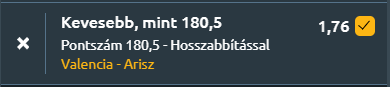 - A Valencia győzelme szinte biztosra vehető, a kérdés csak az, mennyire erőltetik meg magukat, illetve a vendégcsapat fel tudja-e magát pörgetni valamennyire, hogy meccsben legyenek. Az Aris gyenge támadójátéka és Valencia erős védekezése alacsony pontszámú mérkőzést feltételez. A spanyol csapat győzelmével bebiztosíthatja a csoportelsőséget, miközben a görögök számára már nincs tétje a találkozónak. Félgőzös siker lesz kevesebb, mint 181 ponttal.