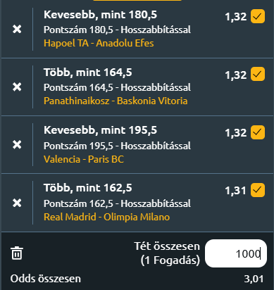 - A Real Madrid hazai pályán rendre hatékonyan játszik, támadójátékukat pedig rendkívül nehéz lassítani, és ezen a téren a várakozás szerint a Milano sem tud majd áttörést elérni. A vendégek ugyanakkor az Euroliga egyik legveszélyesebb hárompontos dobócsapatának számítanak, amit ebben a szezonban a Panathinaikos kétszer is megtapasztalt. Mindez egy olyan mérkőzés képét rajzolja ki, ahol mindkét oldalon hatékony támadójátékra lehet számítani, és a hangsúly egyértelműen a pontszerzésen lesz. Mindezek alapján a mérkőzés összpontszáma jelentősen meghaladhatja a 162,5 pontos határt.