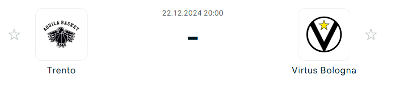 - A Virtus láthatóan az Euroligát preferálja idén! A Serie A-ban hazai pályán szenvedtek meglepő vereséget a Trieste ellen, így 8-3-as mérleggel állnak. Az EuroLeague-ben viszont magabiztosan javítottak, hiszen legyőzték a Barcelonát, ami önbizalmat adhat a folytatásra. A csapatot azonban komoly sérülések sújtják, mivel legjobb játékosuk, Tornike Shengelia, január végéig nem léphet pályára. Helyette Andrejs Grazulis kapott több játékidőt, míg Isaia Cordinier kiváló formát mutatott a Barcelona ellen, 24 ponttal, 7 gólpasszal és 6 lepattanóval. Will Clyburn szintén javuló formát mutat decemberben, míg Marco Belinelli fokozatosan épül be és egyre nagyobb szerepet kap. Dusko Ivanovic vezetőedző energikus és szervezett játékot követel csapatától, amelynek fő erőssége a védekezés lehet. Virtus célja a bajnokságban az élmezőnyhöz való felzárkózás, amihez létfontosságú lenne Trento legyőzése.