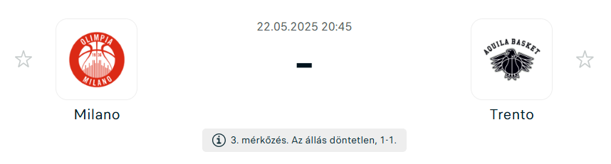 - A harmadik mérkőzés kulcsa Milano számára a dobóhatékonyság javítása és a kulcsemberek (LeDay, Mirotic, Shields) feltámadása lesz. A hazai pálya előnye, a motiváció – különösen az Olasz Kupa-döntő miatti visszavágási vágy – és a játékoskeret mélysége mind Milano győzelme felé billentik a mérleg nyelvét. Trento fiatalos lendülettel és jól szervezett csapatjátékkal próbálja ellensúlyozni ezt, de ha a hazaiak hozzák a várhatóan jobb dobószázalékot, akkor magabiztosabb győzelmet arathatnak, mint az eddigi két szoros idegenbeli találkozón. A cikk szerint Milánótól egy határozottabb, koncentráltabb és dominánsabb teljesítmény várható, amivel valószínűleg le is fogják győzni Trentót legalább 7 pontos különbséggel.
