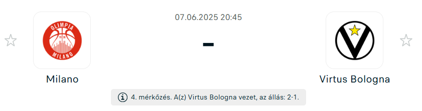 - A Virtus Bologna EuroLiga-szereplése sem volt sikeres. A tavalyi play-in után idén mindössze a 17. helyig jutottak. A Serie A alapszakaszát 23–7-es mérleggel az élen zárták, igaz, a negyeddöntőben megizzadtak, csak az ötödik meccsen jutottak tovább a Velence ellen. Az elődöntőben Milánó ellen azonban taktikus játékkal eddig 2–1-es előnyre tettek szert, főleg a tempó kontrollálására építve. A harmadik mérkőzésen idegenben is nyerni tudtak, annak ellenére, hogy Achille Polonara már nem játszott, Will Clyburn pedig sérülése miatt szintén kihagyta az összecsapást. A győzelem kulcsa Tornike Shengelia és Isaia Cordinier volt, akik egyaránt 19 pontot szereztek, míg Brandon Taylor 12 ponttal és 7 gólpasszal járult hozzá a sikerhez. Az ő teljesítményük kulcsfontosságú lehet ismét, főként, ha Clyburn továbbra is hiányozni fog.