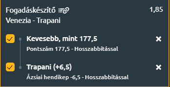 - Összességében a Venezia képes lehet lassítani a Trapani gyors támadójátékát, ezáltal inkább az UNDER-felől közelítek a pontok tekintetében és ha valóban sikeres lesz a lassítás, akkor a meccs szoros lesz. A bukik a Veneziát látják kicsit esélyesebbnek és a gyors támadókosárlabdában jobban hiszek, így plusszos hendikeppel a vendégeket nyeretem.
