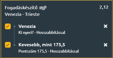 - A Cremona elleni nyitófordulós bajnoki siker után a Trapani elleni hosszabbításos vereség fájóan jött, hiszen a Venezia kezében volt a győzelem, ám a hajrában elfogyott az energia és a koncentráció. A Neptunas elleni diadal azonban azt bizonyította, hogy a védekezésükre és csapategységükre építve komoly ellenfelei lehetnek bárkinek. Spahija mester játékosai közül nyolcan is 8–13 pont között zártak, ami jól mutatja a mélységet és a csapatteljesítményt. Bár a triplázás továbbra is gyenge pont, a kétpontos dobások terén a liga élvonalába tartoznak. A Venezia várhatóan ismét a lassabb, kontrollált tempót igyekszik majd diktálni, hogy kihasználja stabil védekezését és elkerülje a tempós, rohanós játékot. A Trieste gyengén kezdett, négy tétmeccsből mindössze egyet tudtak megnyerni, a Napoli otthonában 84–79-re. A Bajnokok Ligájában eddig nem jött ki a lépés, vereség Würzburgban és otthon a Galatasaraytól, de a törökök elleni második félidő reményt keltő volt. Israel Gonzalez csapata ott megmutatta, hogy gyors, lendületes játékkal képes felzárkózni, bár a stabilitás még hiányzik. A mester elégedett a támadások szervezettségével, de elismerte, hogy a tempós stílus időt igényel. A nagy nevű Juan Toscano-Anderson egyelőre adós a várt teljesítménnyel, bár a legutóbbi meccsén már biztató jeleket mutatott. A Venezia egyértelműen esélyesebb, főként hazai pályán, ahol magabiztosabb és szervezettebb játékra képes. A Trieste még keresi a ritmust, és láthatóan nehezen alkalmazkodik a heti kétfrontos terheléshez. A hazai meccsgyőzelem mellett, a Venezia jó védkezése miatt nem várható több, mint 175,5 pont a meccsen!