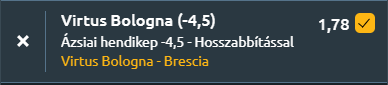 - A Virtus Bologna jó formában van, az utóbbi öt mérkőzésükön egyaránt kimagasló teljesítményt nyújtottak, még az Euroligában is. Bár az első egymás elleni meccset minimális különbséggel elveszítették, a hazai pálya előnye és a revansvágy most mellettük szól. A motiváció adott, és Ivanovic csapata valószínűleg egy sokkal tudatosabb és kontrolláltabb játékot próbál majd ráerőltetni ellenfelére, elsősorban Bilan semlegesítésére építve. Brescia ugyanakkor kiegyensúlyozott, okosan menedzselt csapat, de az egyfrontos terhelés ellenére is szűk rotációval dolgoznak, ami egy fizikálisan megterhelő, komoly tétmeccsen akár hátrány is lehet. A jó formában lévő Virtus így esélyesebb, és ha saját tempójukban tudják játszani a meccset, reális a hazai győzelem, még egy kicsi mínuszos hendikepről is!