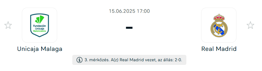 - A Real Madrid elképesztő formában érkezik Malagába, miután a szezonban végig dominálta az Endesa Ligát és az alapszakasz élén végzett. A rájátszásban is kiválóan teljesítenek, és az első két mérkőzésen egyértelműen felülmúlták Unicaját. Sergio Llull különösen kiemelkedő formát mutat, 37 évesen is a csapat egyik legfontosabb láncszeme. Facundo Campazzo és Mario Hezonja is remekeltek a legutóbbi találkozón, mindketten 18 pontot szereztek. Walter Tavares domináns palánk alatti teljesítményt nyújtott, amely kulcsfontosságú lehet a sorozat lezárásához. Bár a Real Madrid tudja, hogy papíron fölényben van, Chus Mateo nem engedheti meg, hogy csapata elbizakodottá váljon. Ráadásul Madrid ebben az idényben kétszer is kikapott Unicajától a Spanyol Szuperkupa és a Copa del Rey döntőjében, így a visszavágás motiváló tényező lehet.