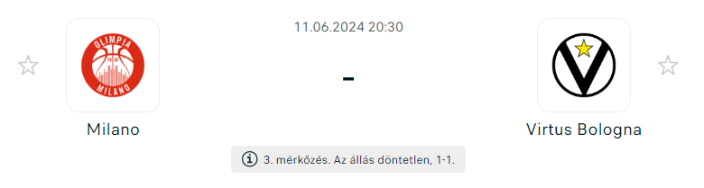 - Az Olimpia a mérkőzés favoritja a harmadik mérkőzésen, és otthoni szurkolói előtt szeretnék biztosítani az otthoni pálya előnyét, és még közelebb kerülni a bajnoki trófeához. Mindkét csapatnak nagy problémái vannak sérülés fronton és kevesebb lehetőség van a rotációra. Ha az Olimpia rá tudja kényszeríteni a játékát a Virtusra, akkor hatékonyabb lesz, mint az előző kettő, ami nyilvánvalóan jobban illik a Milano játékosaihoz. És akkor nyerhetnek!