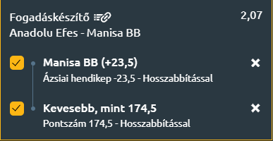 - Hatalmas különbség van a két csapat között, ezért az Efes magabiztos győzelmet arathat, de a különbség mértéke kérdéses. A fáradtabb, ám minőségileg sokkal erősebb hazaiak esetében előfordulhat, hogy a koncentráció nem marad végig egyenletes, így a Manisa számára reális esély nyílhat arra, hogy elkerülje a súlyos vereséget, a pontszám pedig 171,5 pont alatt maradhat.