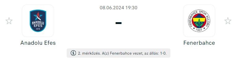 - Az Anadolu Efes csapatától mindenképp javulást várhatunk a második mérkőzésen, miután az első mérkőzésen elvesztették a hazai pálya előnyét. Az első mérkőzésen gyengén teljesítettek, semmi sem működött jól számukra. A támadójátékuk nem találta meg a ritmust az első három negyedben, és a védekezésük is lassú és inaktív volt. Ercan Osmani, Dan Oturu és Shane Larkin voltak az egyetlenek, akik jól teljesítettek; Osmani 18 pontot, Oturu és Larkin pedig egyaránt 16 pontot szerzett. Ahhoz, hogy szombaton megszerezzék az első győzelmüket a sorozatban, más játékosoknak is fel kell nőniük a feladathoz.