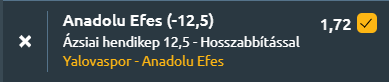 - Az Anadolu Efes jelentős minőségi fölénye alapján egyértelmű esélyese a mérkőzésnek, különösen, ha a csapat motiváltan lép pályára. A Yalovaspor lelkes és javuló formája dicséretes, de a vendégek összeszedett játékával szemben valószínűleg kevésnek bizonyul. Az Efes várhatóan maximális koncentrációval érkezik, hogy javítsa a bajnoki pozícióját. Mindez pedig azt jelenti, hogy egy komolyabb mínuszos hendikepről is nyerhet.