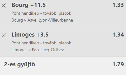 A francia bajnokságból raktam össze két meccset. A Lyon nyilván erősebb, mint a hazai csarnokban fellépő Bourg, de nekik nagyon fontos Euroliga-meccsük lesz négy nap múlva otthon, az Alba ellen, amely nyerhető meccs és kötelező lenne. Ezért mindenképp tartalékos Lyont várok és szoros meccset. 11,5-es hendivel nyeretem a Bourg-t. A másik találkozó a Limoges – Pau, ahol a hazai gárda az esélyesebb, de itt is lehet szorosabb a meccs, bár ennek kisebb az esélye. Itt egy kisebb hendit választottam.